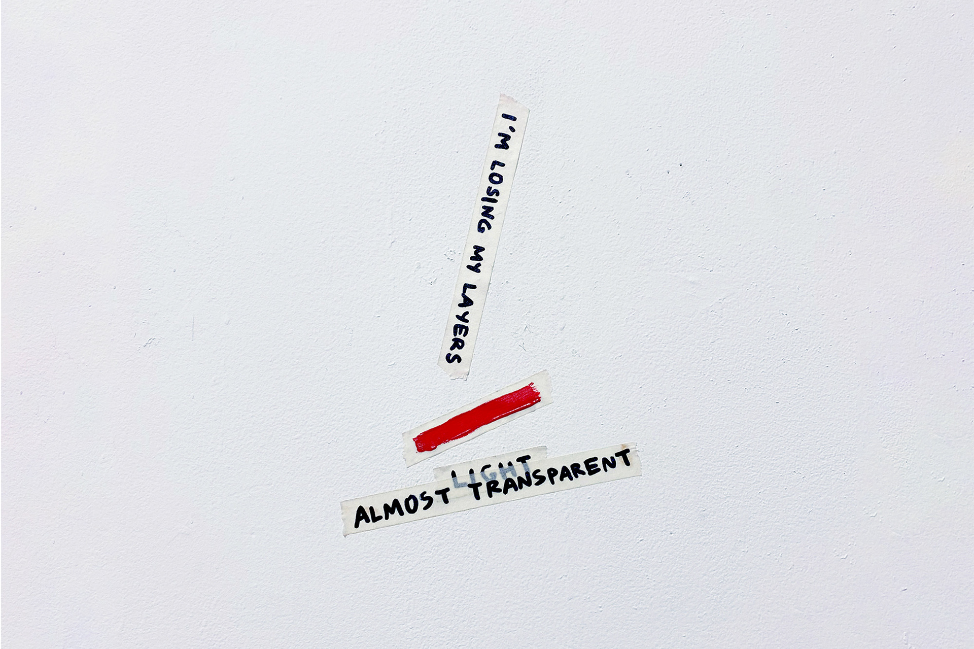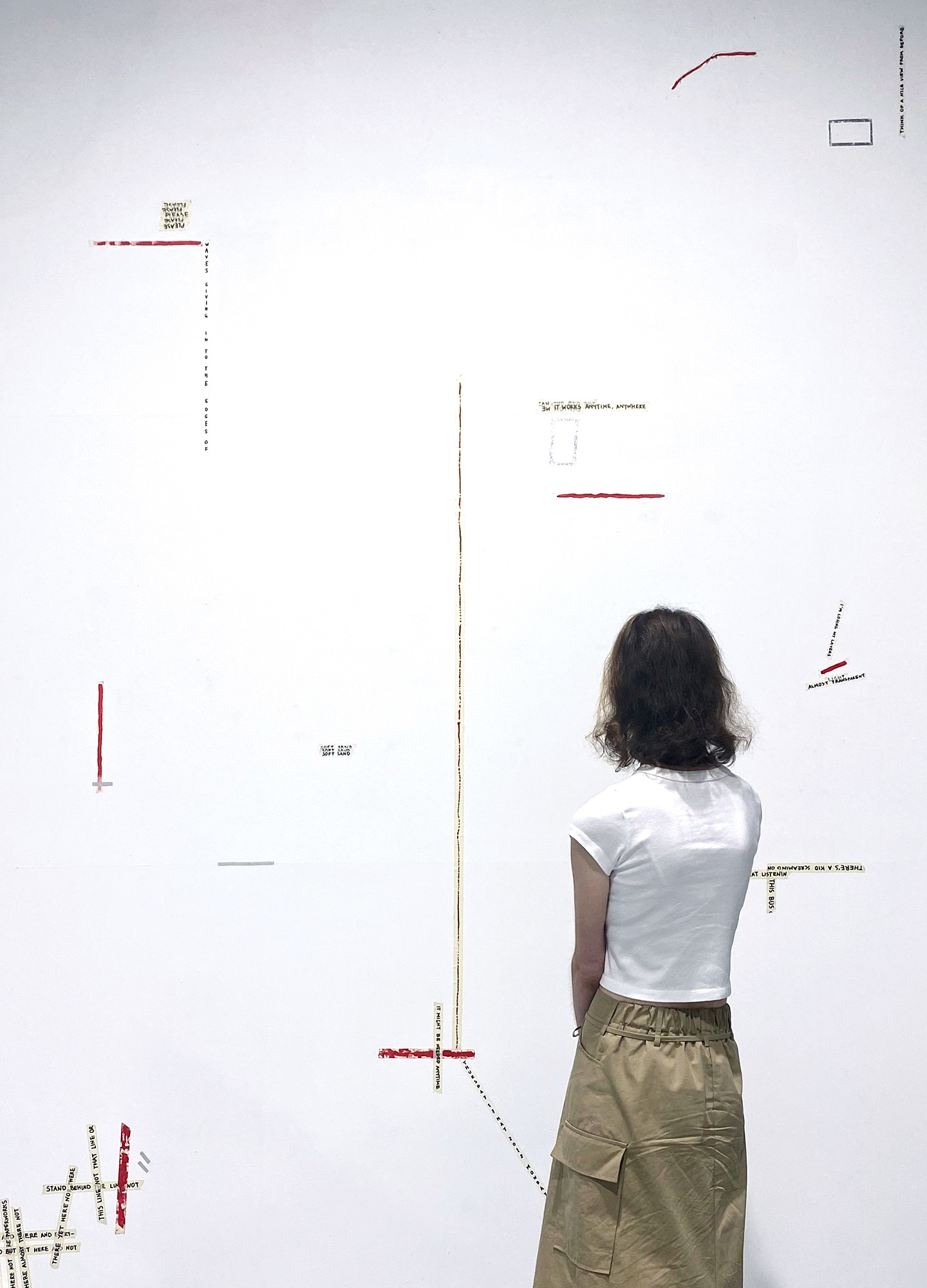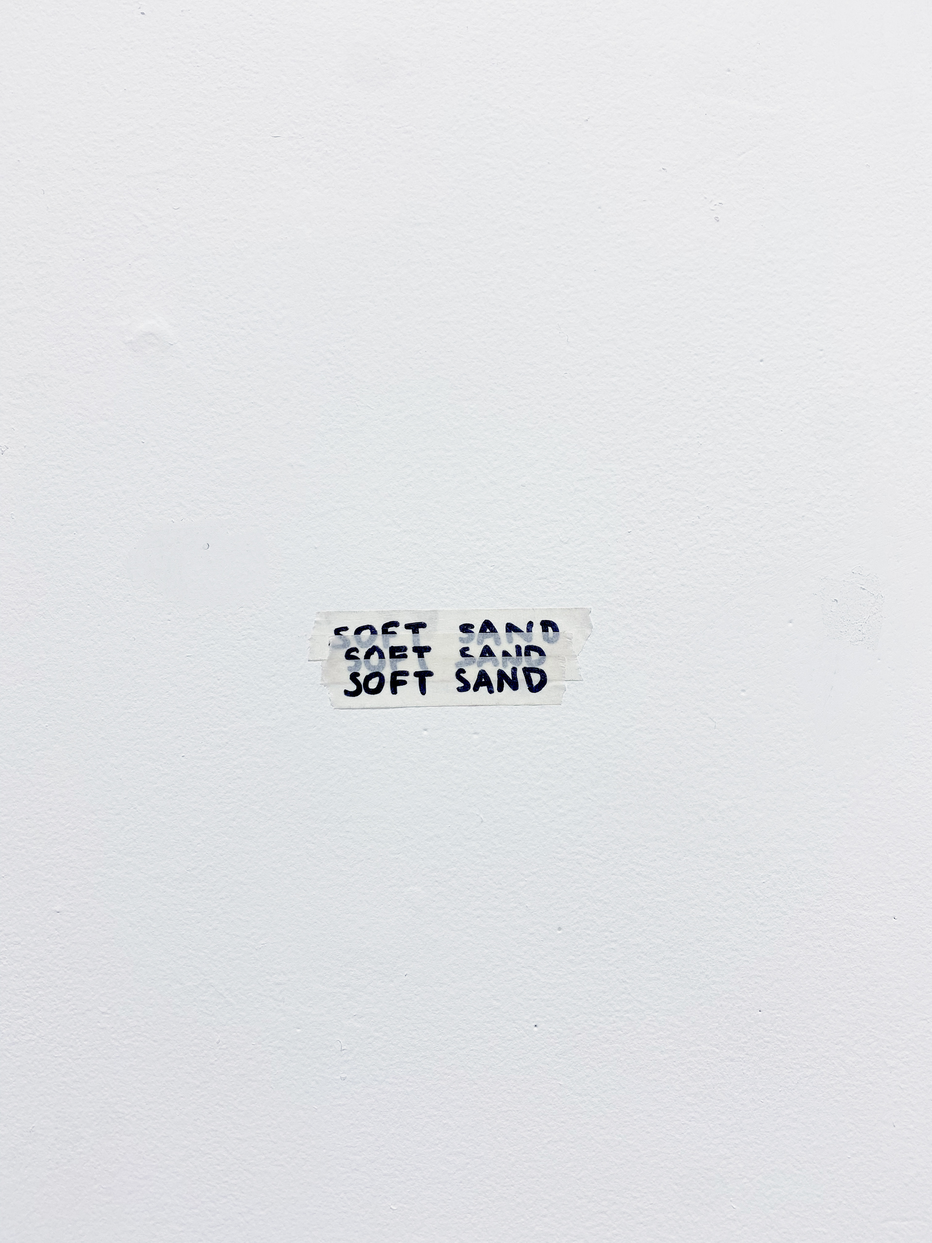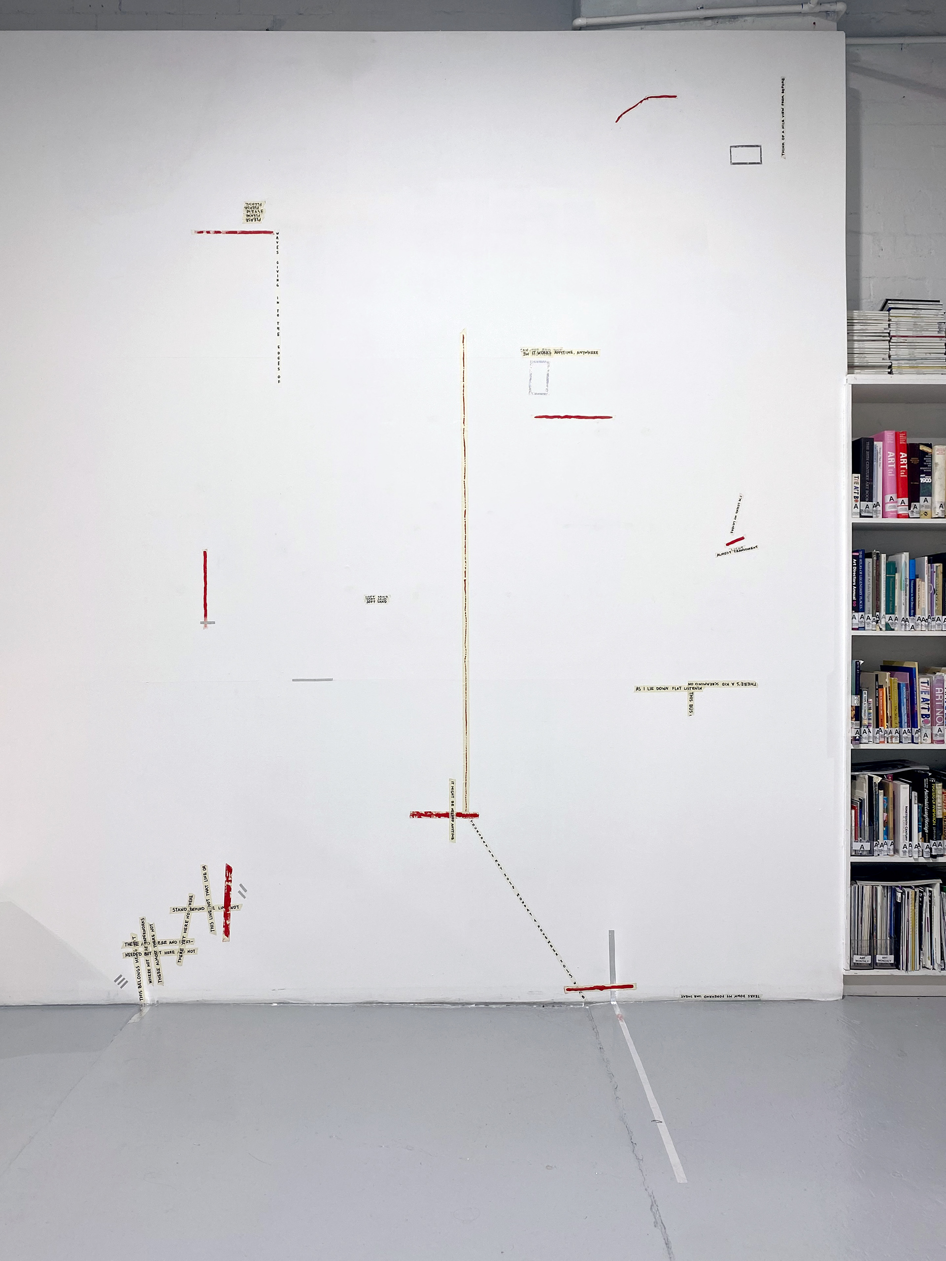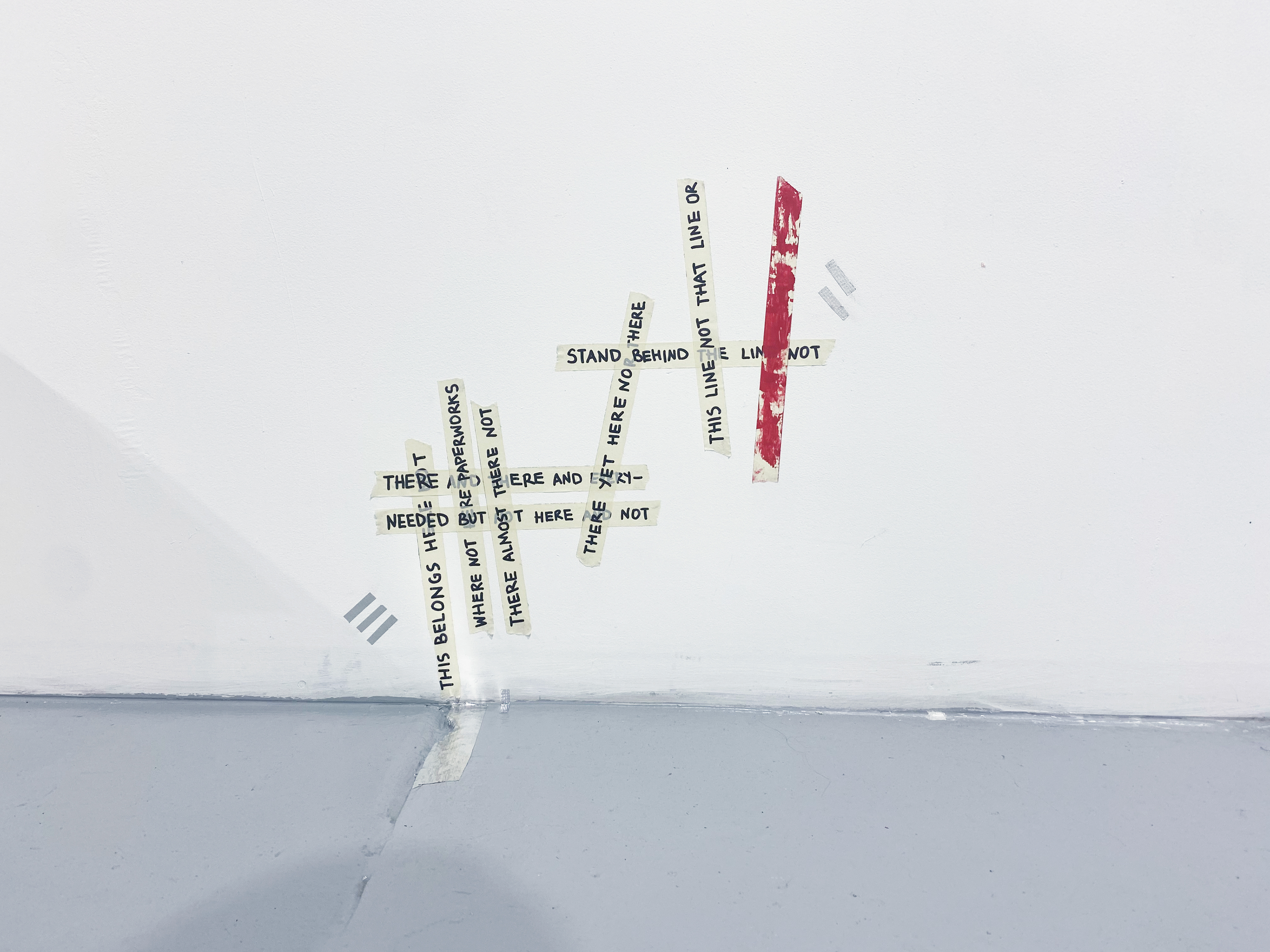 Working directly on the gallery wall, the process started as a form of expanded painting. Masking tape, usually sitting around in my studio as a tool, becomes both medium and surface in this work.