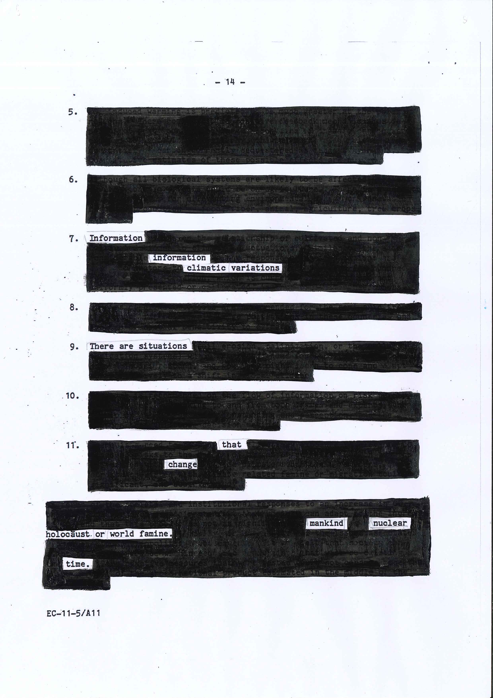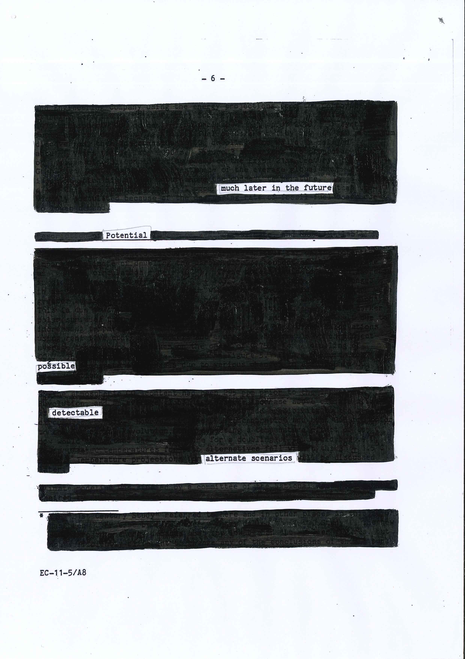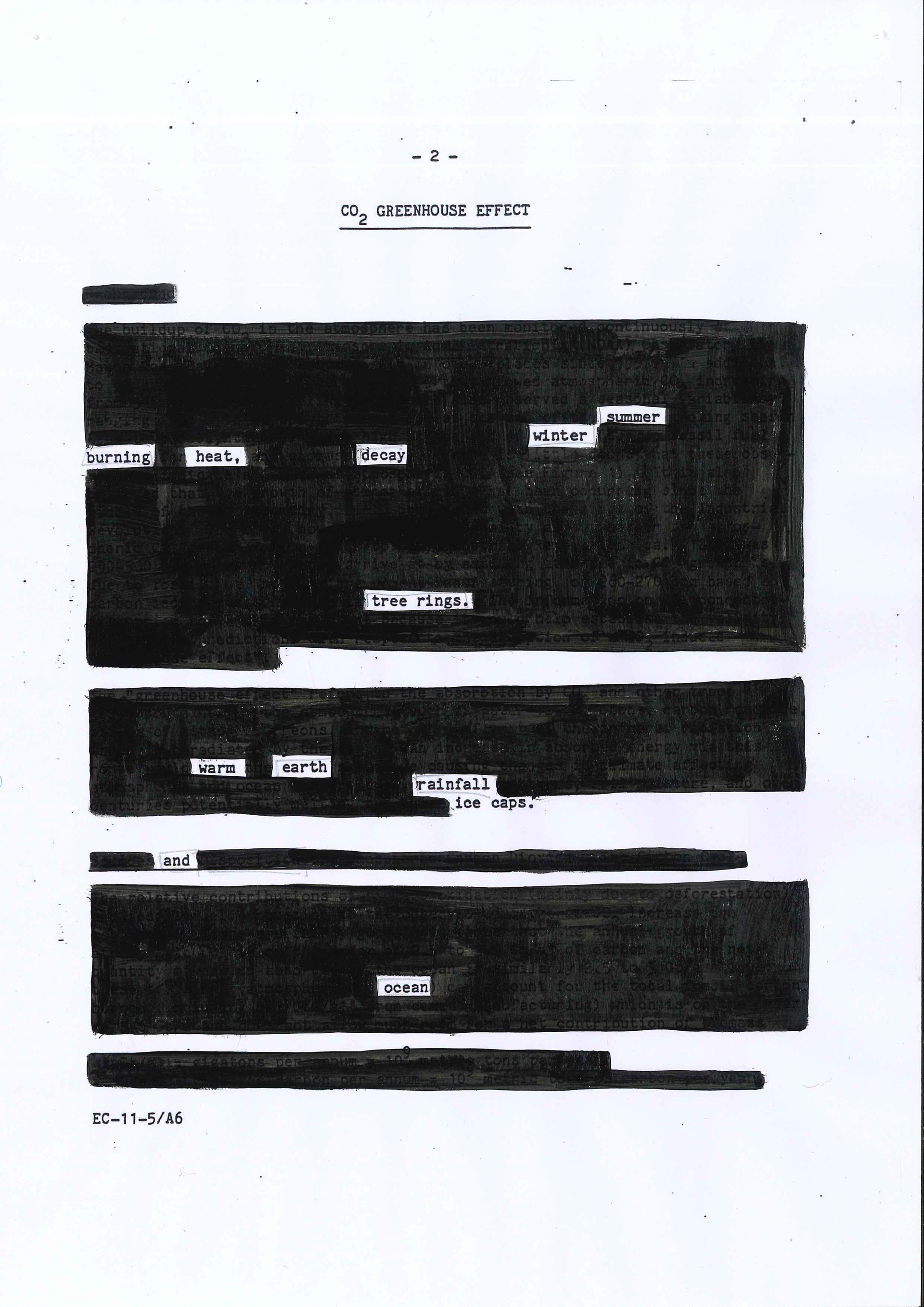 Pages from the scientific report blacked-out using black glossy acrylic to mimic crude oil. This report was initially hidden from the public for years, despite containing early data on the effect of CO2 emission on Earth’s temperature.