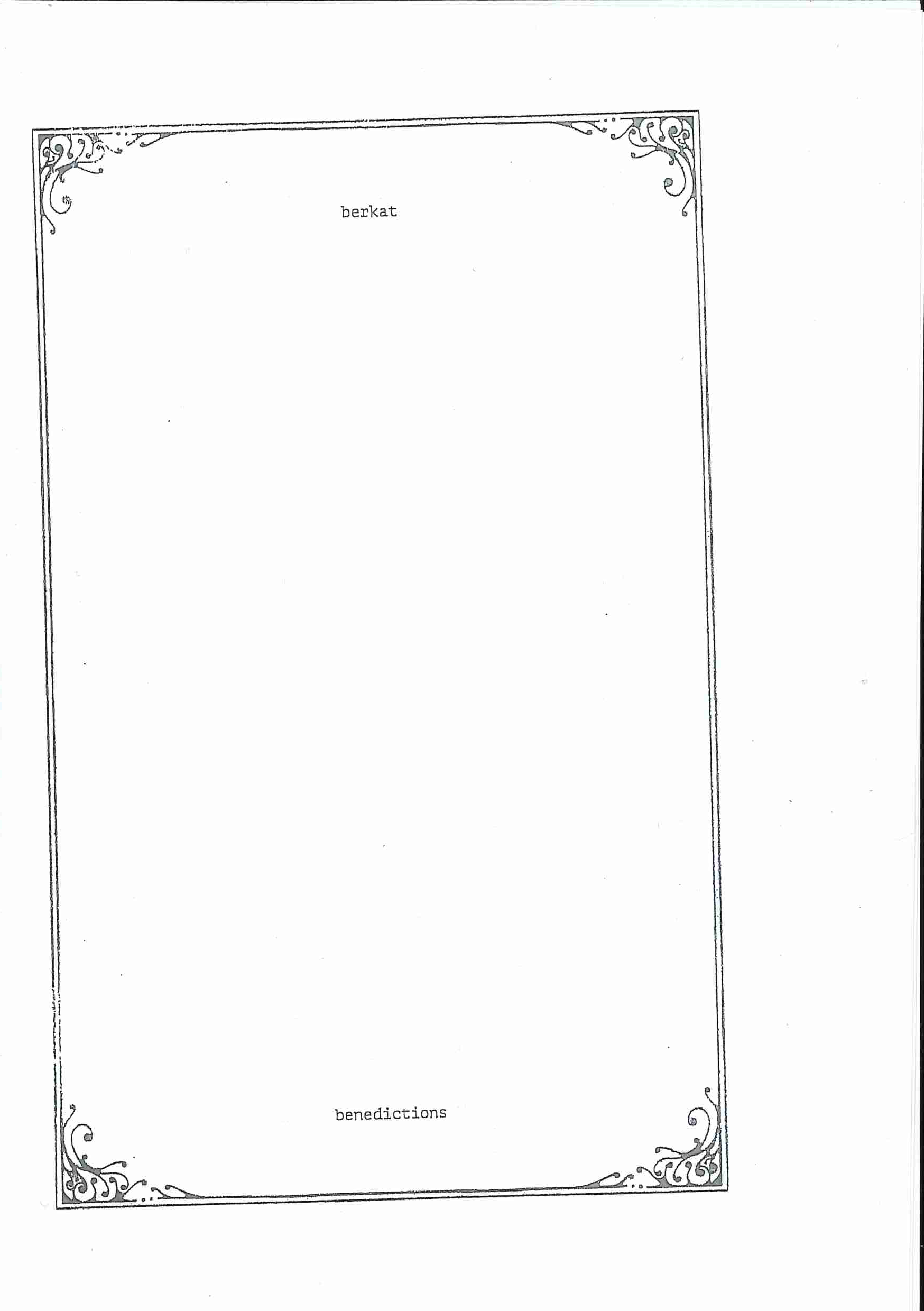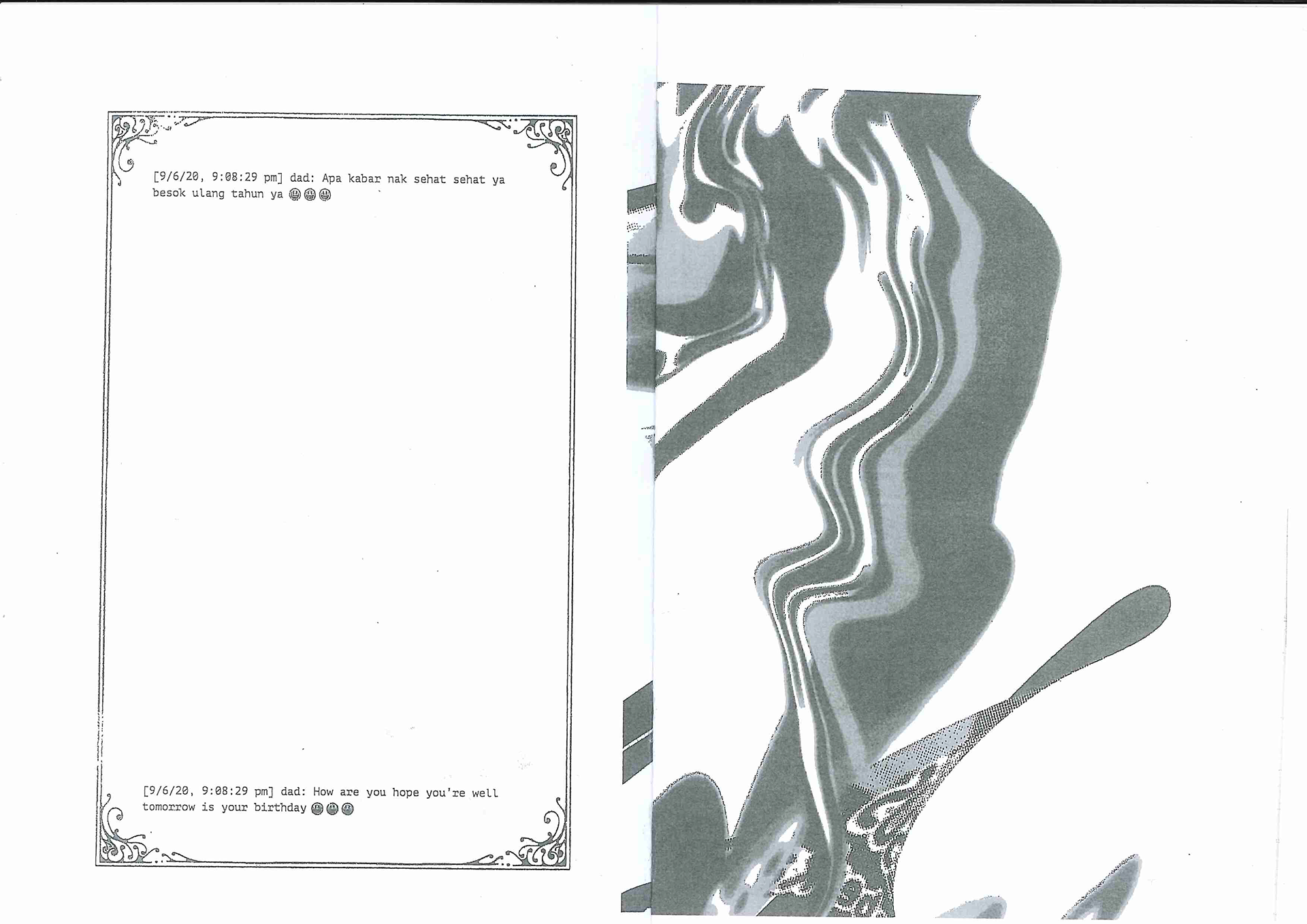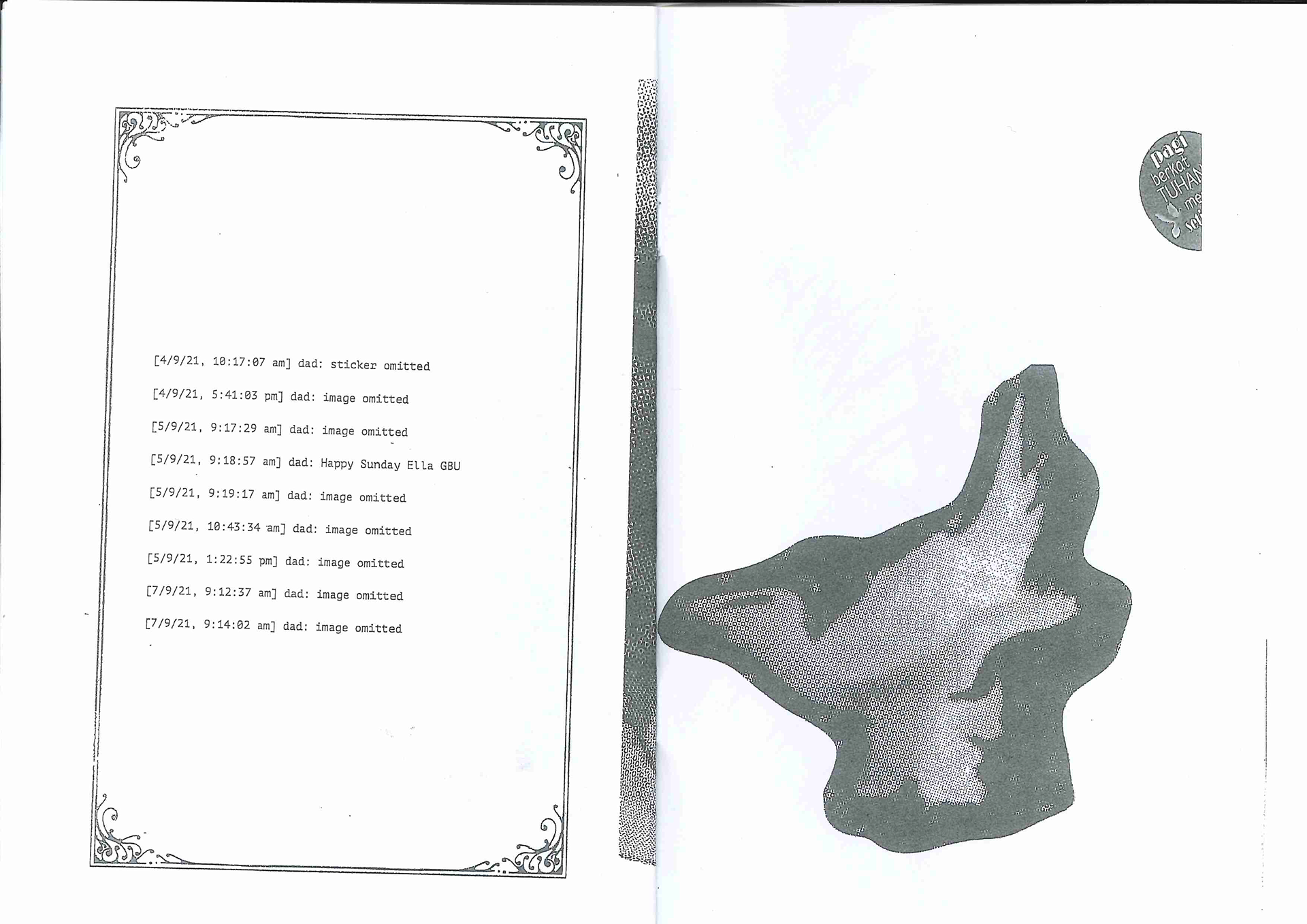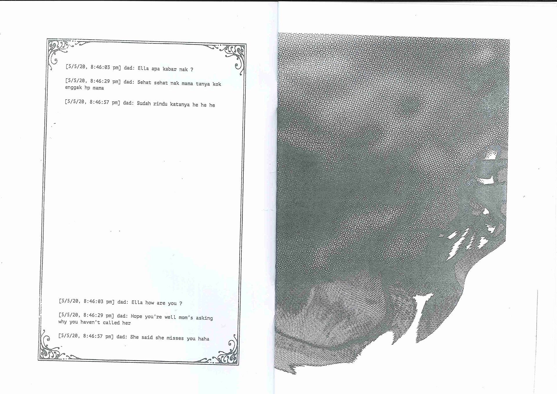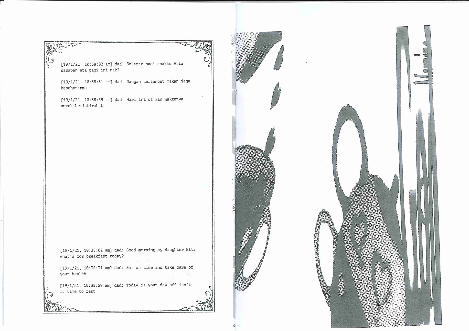 The booklet contains texts from WhatsApp conversations with my dad, both in the original Indonesian language and the English translation. The texts are accompanied with distorted images of the digital stickers he shares frequently, which often convey religious messages. The format of the booklet mimics that of a liturgy booklet at church.